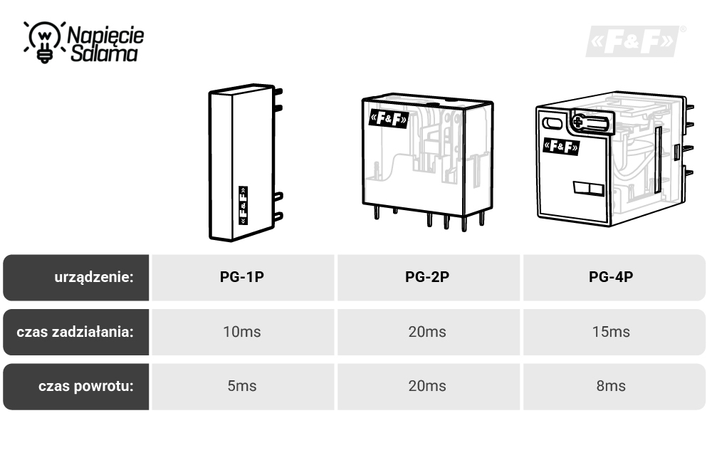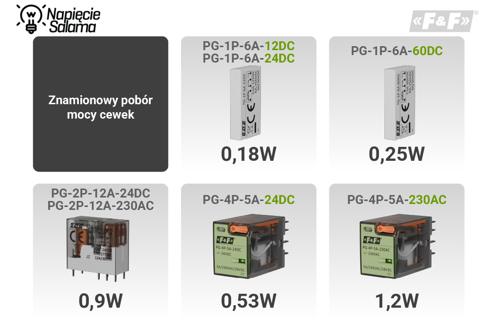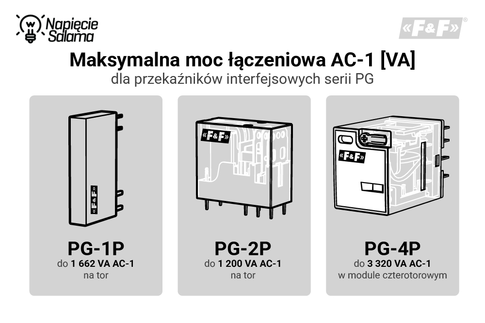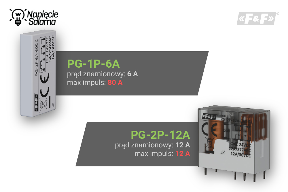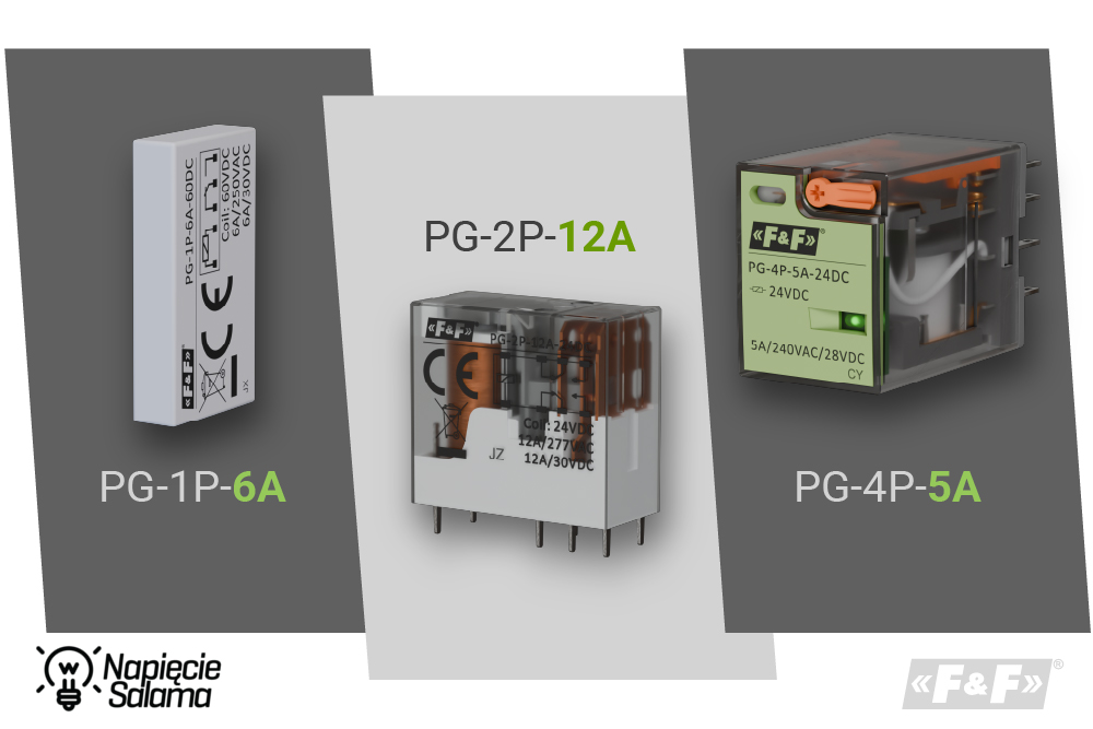 Właśnie dlatego przy projektowaniu układu należy dobrać przekaźnik nie tylko pod kątem napięcia zasilania cewki, ale przede wszystkim pod kątem prądu, jaki mają przenosić zestyki. Dla przykładu przekaźniki F&F serii PG mają różną obciążalność: 6 A w modelach PG‑1P, 12 A w PG‑2P oraz 5 A w kompaktowych przekaźnikach czterotorowych PG‑4P. Wybór odpowiedniego modelu zapewnia pracę zestyków w zakresie parametrów przewidzianych przez producenta oraz ogranicza ich obciążenie cieplne w pracy ciągłej.