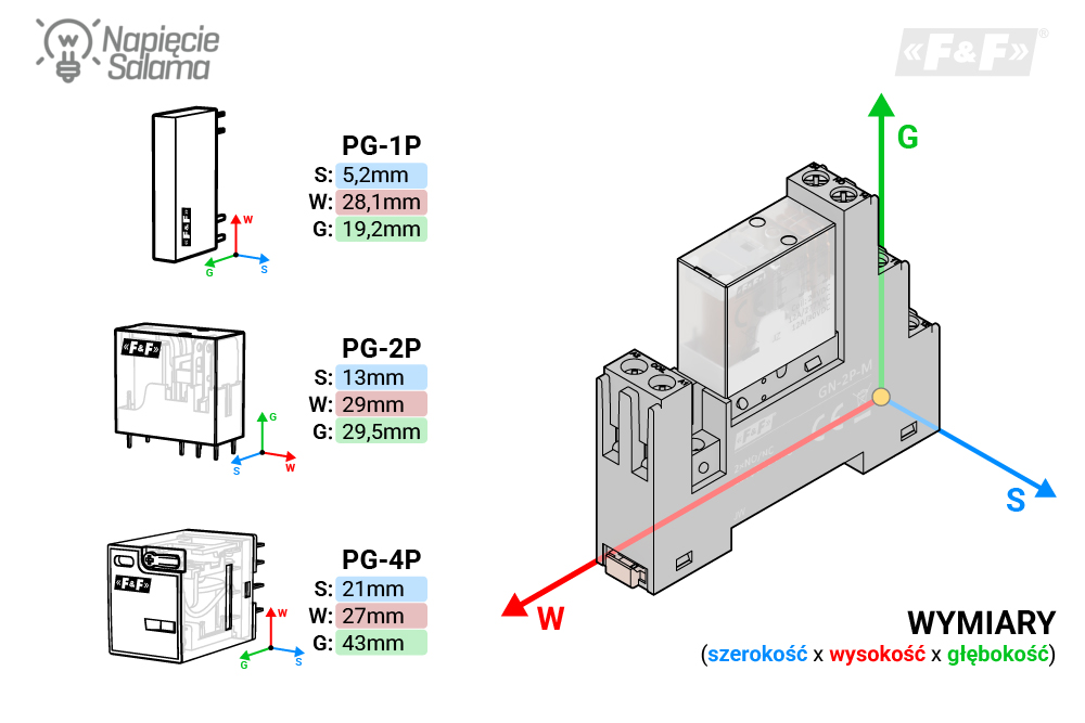 Wymiary przekaźnika określają, jak dużo miejsca zajmuje on w rozdzielnicy, jak wpływa na prowadzenie kabli oraz jakie warunki montażowe trzeba zapewnić, aby przekaźnik pracował stabilnie. W serii PG przekaźników interfejsowych F&F typowe wymiary to 5,2 × 28,1 × 19,2 mm dla PG‑1P oraz 21 × 27 × 42,5 mm dla PG‑4P, różnice te przekładają się na sposób planowania rozdzielnicy.