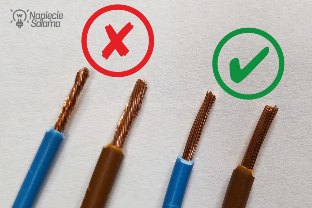 Wprowadzenie do szybkozłączki zaśniedziałych żył przewodu. Nawet nowe przewody jeśli są przechowywane w złych warunkach (szczególnie jeśli dostanie się do nich wilgoć) mogą nadawać się … na złom. Na różnych obiektach stosunkowo często spotykam się z miedzianymi żyłami (linka lub drut) pokrytymi czarnym nalotem. Kilkukrotnie zwracałem uwagę instalatorom, którzy taką „czarną” żyłę wciskali do szybkozłączki, lub tym, którzy na różne sposoby próbowali ją doczyścić (skrobali nożem drut, lub co gorsza w ten sam sposób próbowali doczyścić pojedyncze druciki w żyłach wielodrutowych). Czy tak podłączona instalacja będzie działać? Raczej tak, ale pod wpływem przepływu prądu tak wykonane połączenie będzie się nadmiernie grzać, a w przypadku większych prądów doprowadzi do zniszczenia (stopienia) szybkozłączki. W takim wypadku wina za uszkodzenie szybkozłączki jest jedynie po stronie osoby która dokonała połączenia.