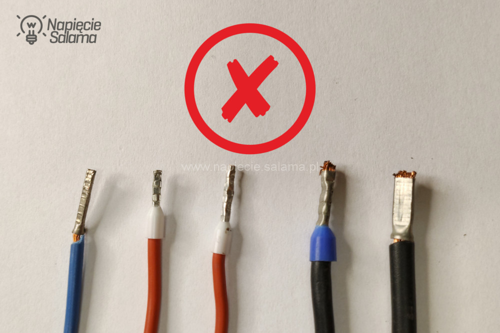Podstawowy błąd polega na złym odizolowaniu przewodu. Izolacja zdjęta na zbyt długim odcinku zwiększa ryzyko wystąpienia zwarcia lub porażenia prądem (przewodzące części przewodu dostępne poza szybkozłączką). Natomiast izolacja zdjęta na krótszym odcinku może spowodować, że żyła przewodu nie będzie odpowiednio „umocowana” w szybkozłączce przez co sprężyna nie zapewni właściwego połączenia. Pamiętaj, w zależności od producenta izolację trzeba ściągnąć na właściwym odcinku który u różnych producentów może być inny (rutyna doprowadza do błędów zawsze sprawdź wytyczne producenta). Do Idealnej Szybkozłączki izolację należy ściągnąć na odcinku 13 mm.