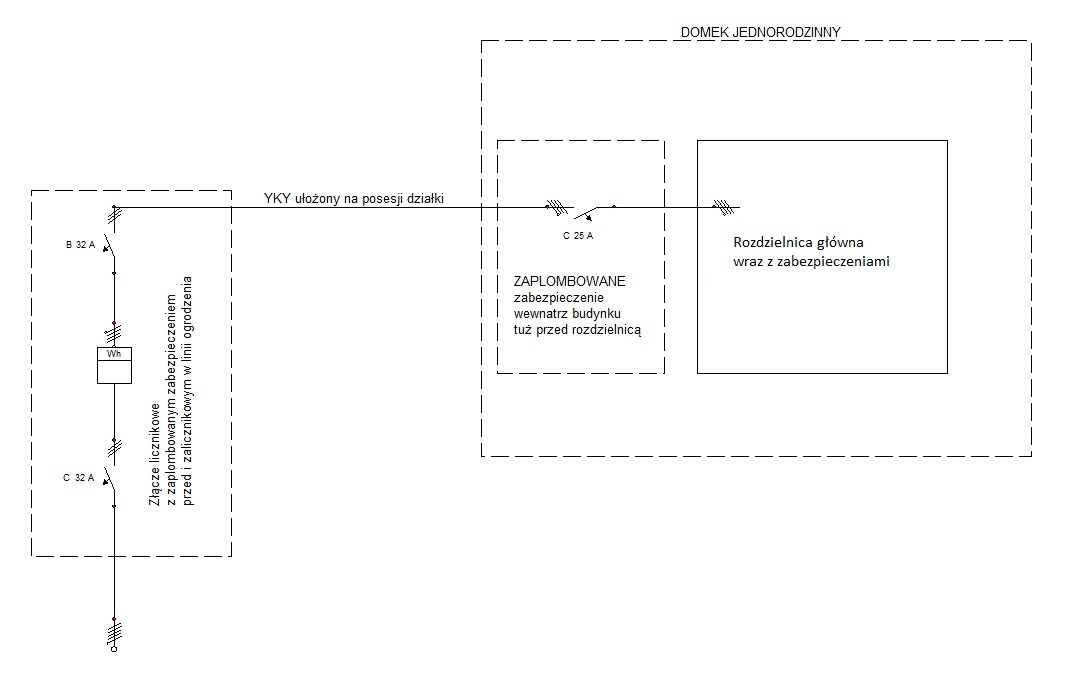 Znam rejony w Polsce w których (mowa o domkach jednorodzinnych) zaplombowane zabezpieczenie przedlicznikowe i zalicznikowe umieszczone jest w linii ogrodzenia. Kabel, który od zaplombowanego zabezpieczenia zalicznikowego poprowadzony jest do budynku, tuż przed samą rozdzielnicą musi być powtórnie zabezpieczony i zaplombowany przez dostawce energii.