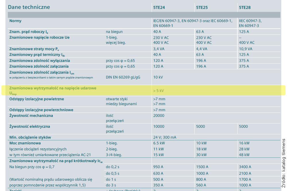 Przeanalizujmy poniższe wycinki katalogu Siemens dotyczące rozłączników modułowych: